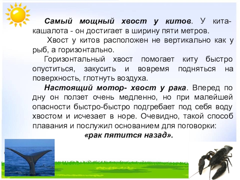 Настоящий мотор- хвост у рака. Вперед по дну он ползет очень медленно, но при малейшей опасности быстро-быстро подгребает под себя воду хвостом и исчезает в норе. Очевидно, такой способ плавания и послужил основанием для поговорки: