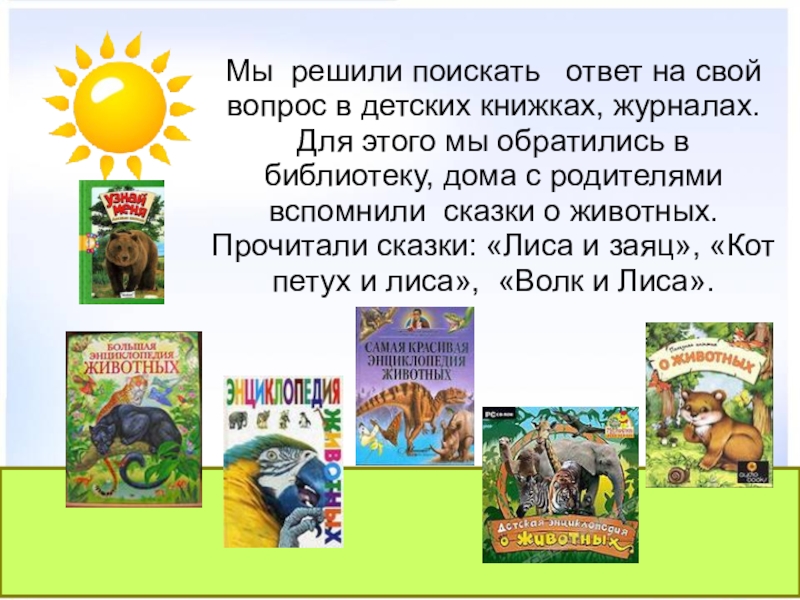 в детских книжках, журналах. Для этого мы обратились в библиотеку, дома с родителями вспомнили сказки о животных.