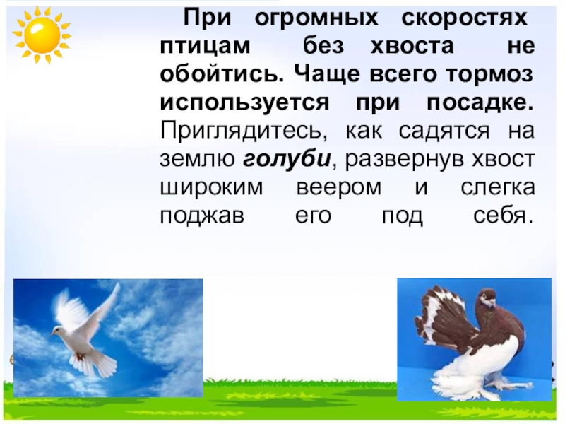 Слайд 17 При огромных скоростях птицам без хвоста не обойтись. Чаще всего
