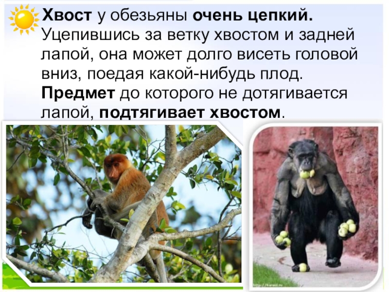 Слайд 21 Хвост у обезьяны очень цепкий. Уцепившись за ветку хвостом и