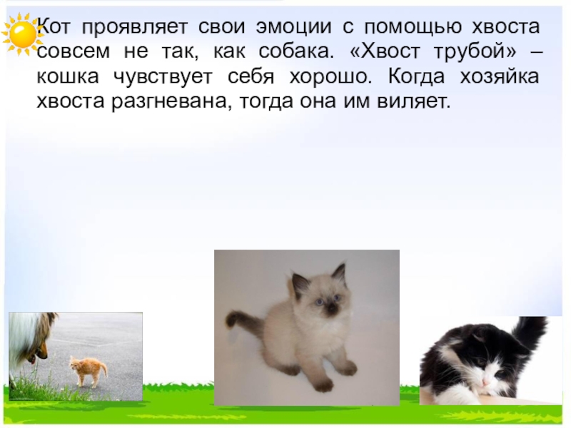 собака. «Хвост трубой» – кошка чувствует себя хорошо. Когда хозяйка хвоста разгневана, тогда она им виляет.