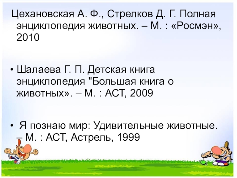 Слайд 43 Цехановская А. Ф., Стрелков Д. Г. Полная энциклопедия животных. –