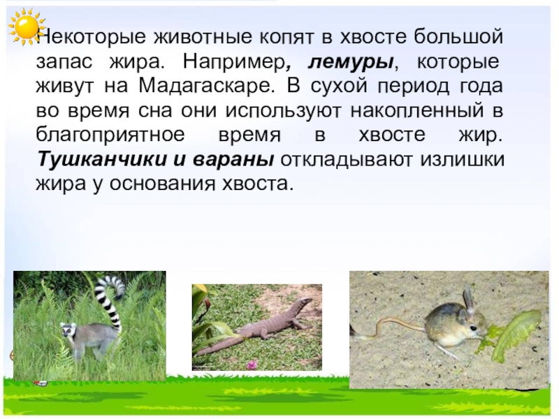 Некоторые животные копят в хвосте большой запас жира. Например, лемуры, которые
