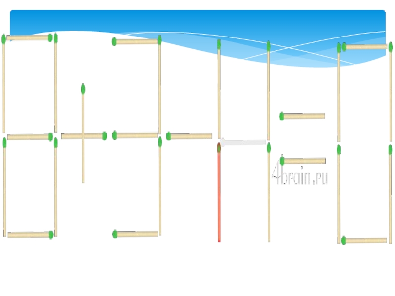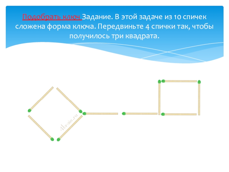 Подобрать ключ Задание. В этой задаче из 10 спичек сложена форма ключа. Передвиньте 4 спички так, чтобы