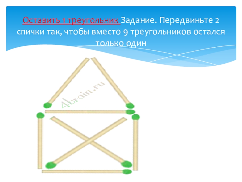 Оставить 1 треугольник Задание. Передвиньте 2 спички так, чтобы вместо 9 треугольников остался только один