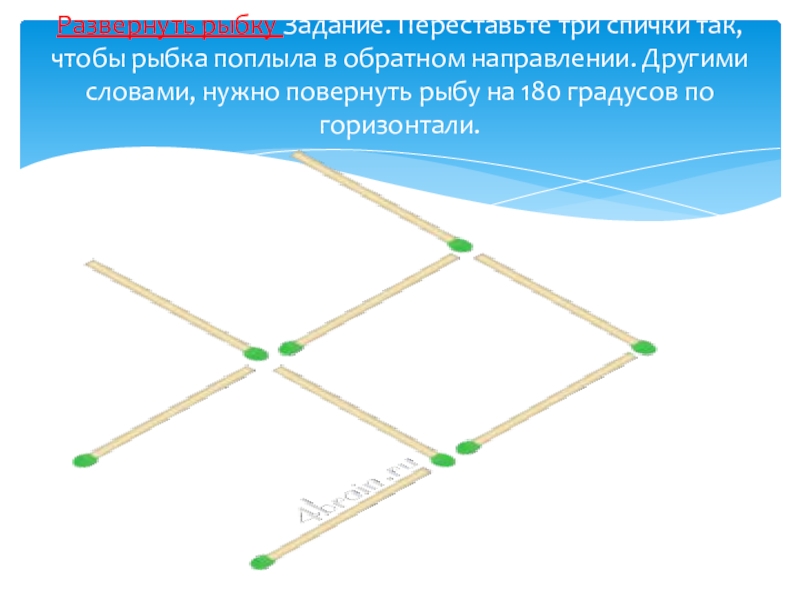 Развернуть рыбку Задание. Переставьте три спички так, чтобы рыбка поплыла в обратном направлении. Другими словами, нужно повернуть