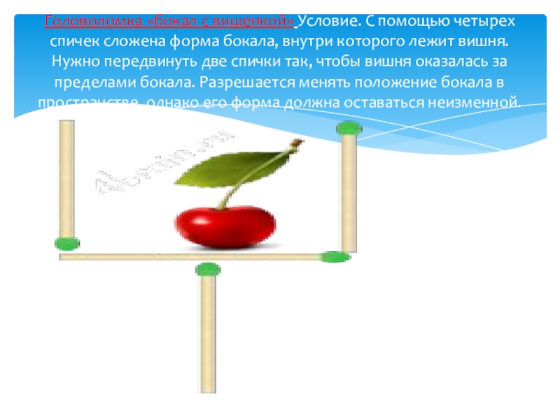 Слайд 9Головоломка «бокал с вишенкой» Условие. С помощью четырех спичек сложена форма