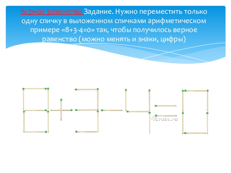 Верное равенство Задание. Нужно переместить только одну спичку в выложенном спичками арифметическом примере «8+3-4=0» так, чтобы получилось