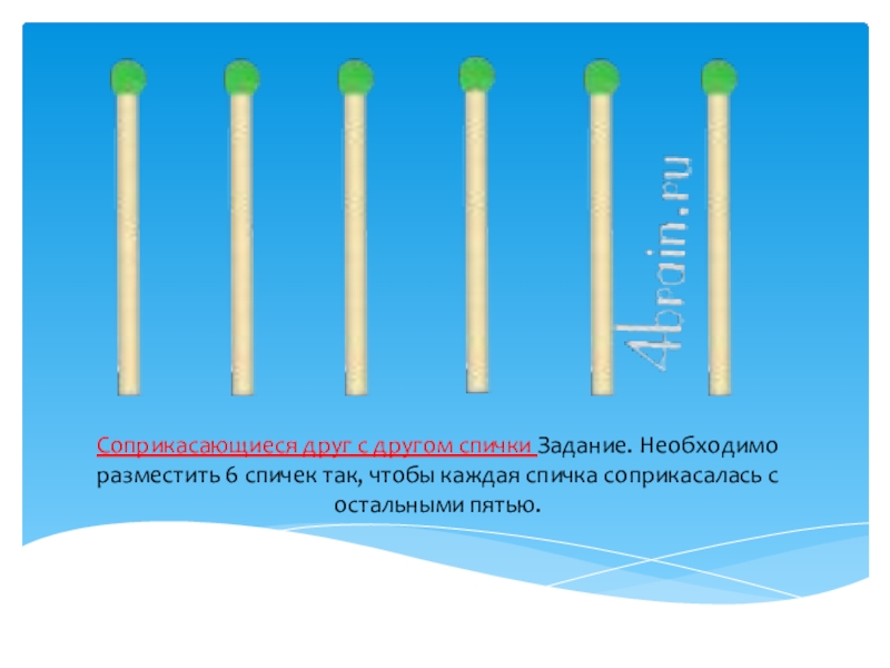 Слайд 2Соприкасающиеся друг с другом спички Задание. Необходимо разместить 6 спичек так,