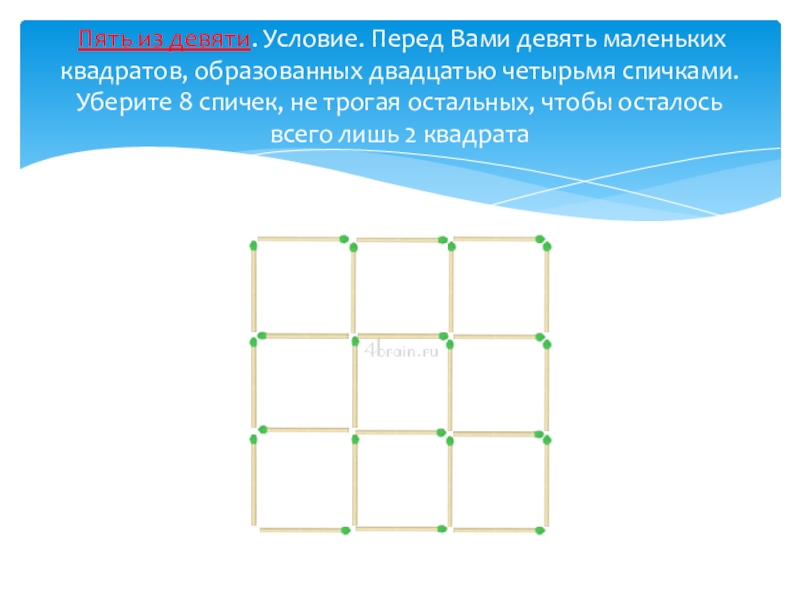 Слайд 4 Пять из девяти. Условие. Перед Вами девять маленьких квадратов, образованных