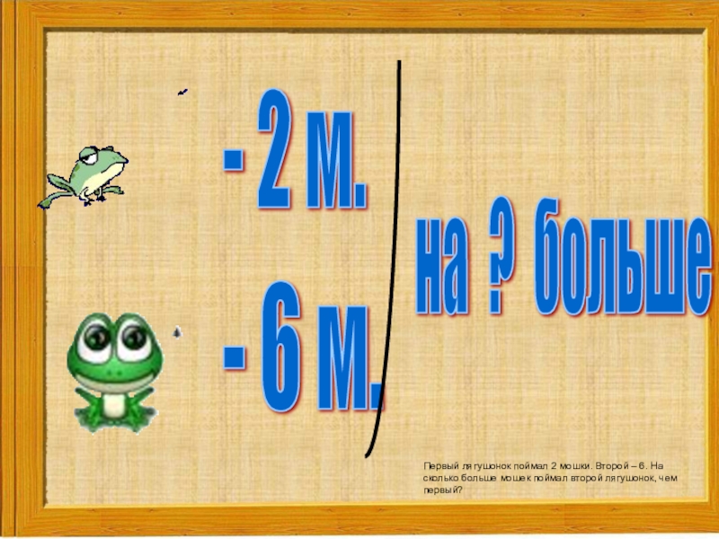 Первый лягушонок поймал 2 мошки. Второй – 6. На сколько больше мошек поймал второй лягушонок, чем первый?