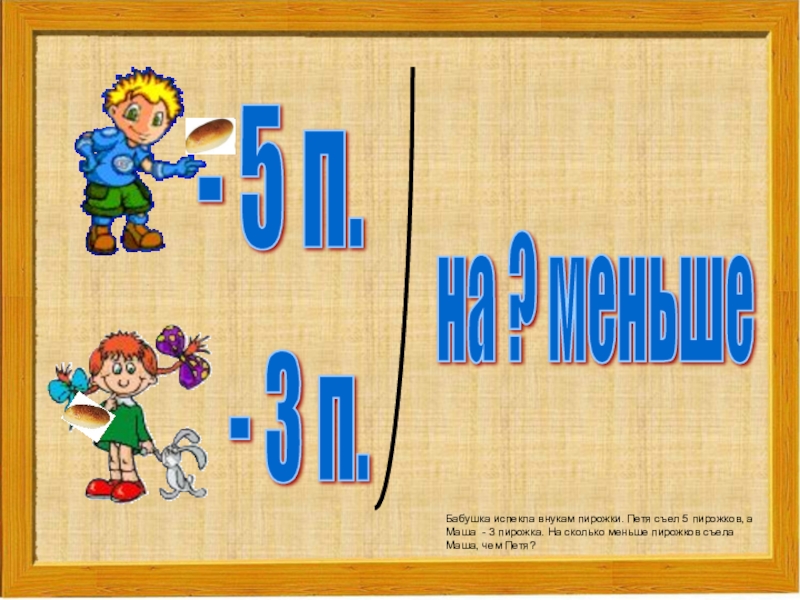 Бабушка испекла внукам пирожки. Петя съел 5 пирожков, а Маша - 3 пирожка. На сколько меньше пирожков съела Маша, чем Петя?