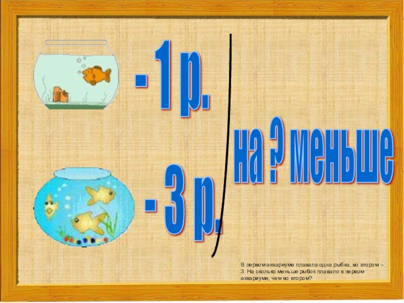 В первом аквариуме плавала одна рыбка, во втором – 3. На сколько меньше рыбок плавало в первом аквариуме, чем во втором?