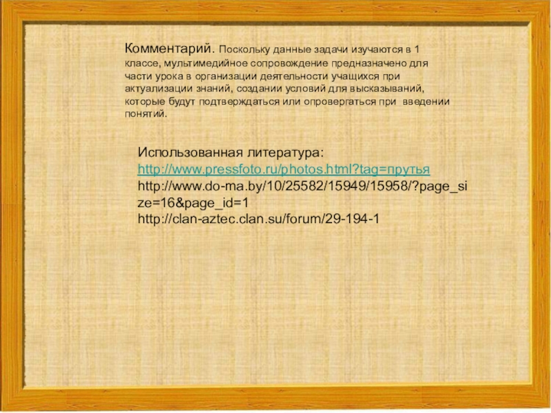 Комментарий. Поскольку данные задачи изучаются в 1 классе, мультимедийное сопровождение предназначено для части урока в организации деятельности учащихся при актуализации знаний, создании условий для высказываний, которые будут подтверждаться или опровергаться при введении понятий.