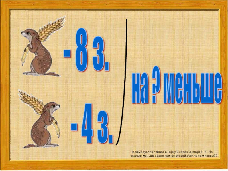 Первый суслик принёс в норку 8 зёрен, а второй - 4. На сколько меньше зёрен принёс второй суслик, чем первый?