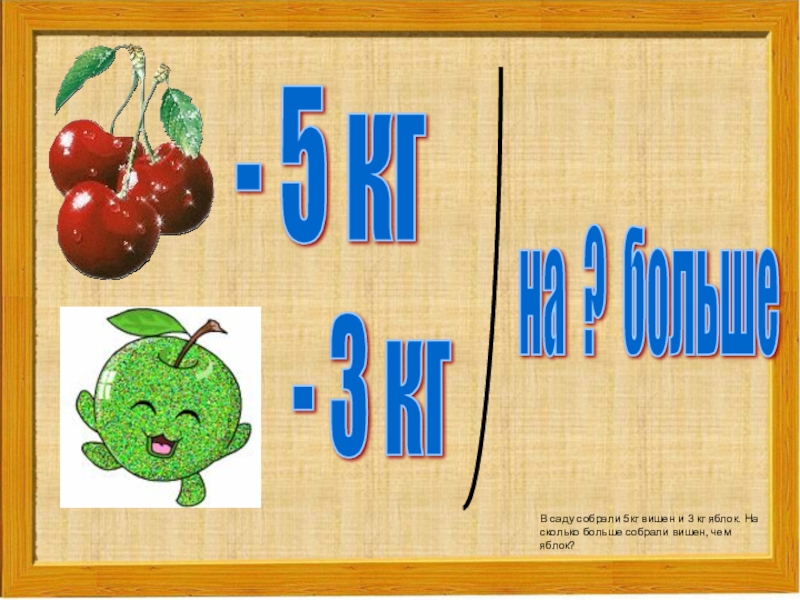 В саду собрали 5кг вишен и 3 кг яблок. На сколько больше собрали вишен, чем яблок?