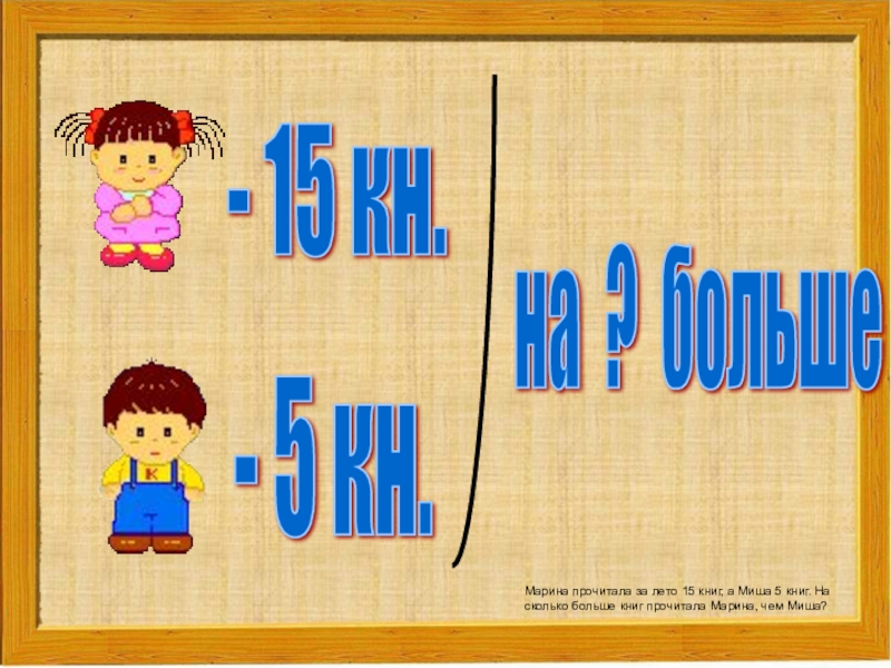Марина прочитала за лето 15 книг, а Миша 5 книг. На сколько больше книг прочитала Марина, чем Миша?