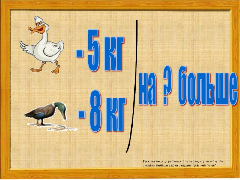 Гусю на месяц требуется 5 кг зерна, а утке – 8кг. На сколько меньше зерна съедает гусь, чем утка?