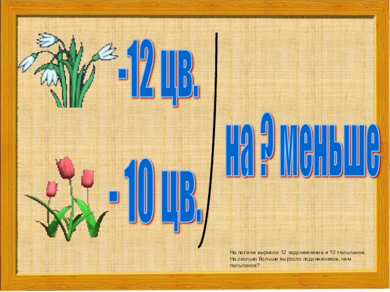 На поляне выросло 12 подснежников и 10 тюльпанов. На сколько больше выросло подснежников, чем тюльпанов?