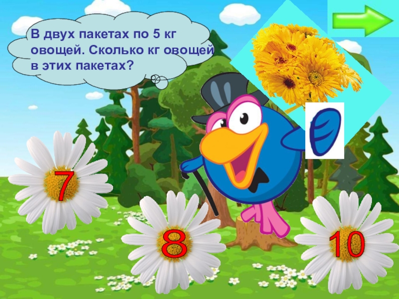 В двух пакетах по 5 кг овощей. Сколько кг овощей в этих пакетах?