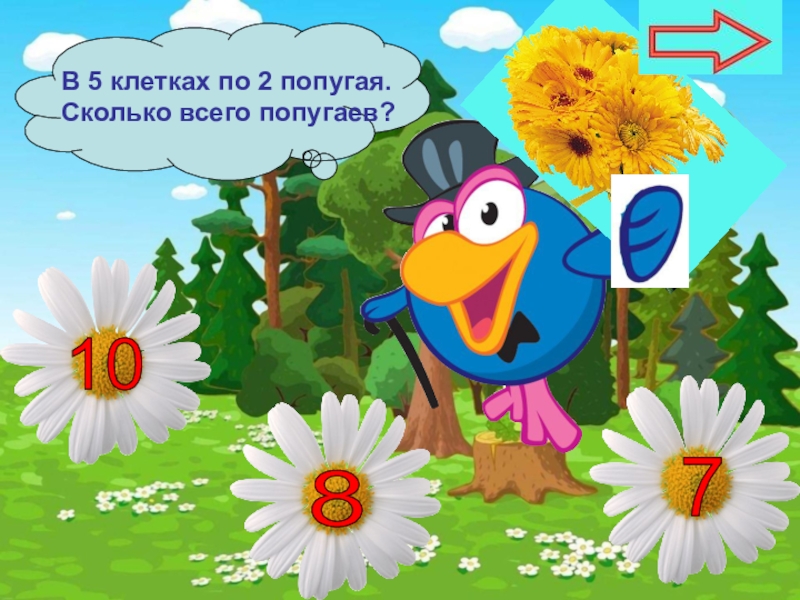 В 5 клетках по 2 попугая. Сколько всего попугаев?