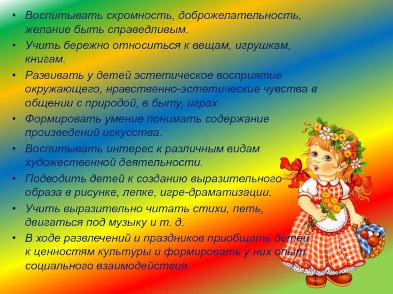 Воспитывать скромность, доброжелательность, желание быть справедливым.Учить бережно относиться к вещам, игрушкам, книгам.Развивать у детей эстетическое восприятие окружающего,