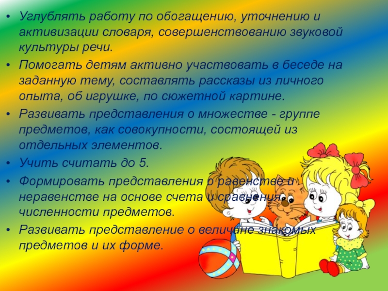 Слайд 4Углублять работу по обогащению, уточнению и активизации словаря, совершенствованию звуковой культуры