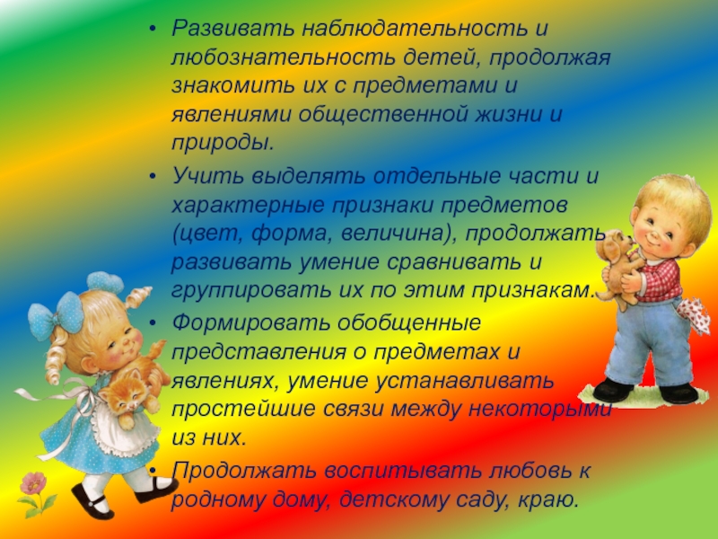 Слайд 3Развивать наблюдательность и любознательность детей, продолжая знакомить их с предметами и