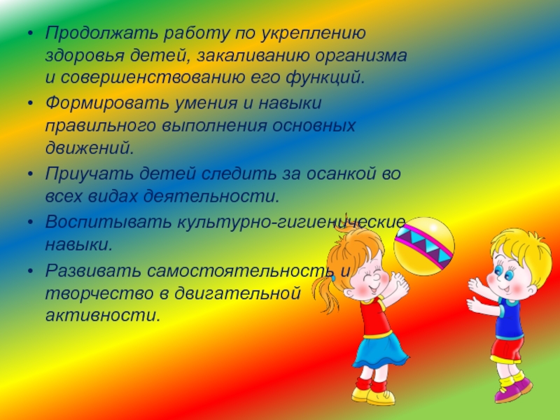 Продолжать работу по укреплению здоровья детей, закаливанию организма и совершенствованию его функций.Формировать умения и навыки правильного выполнения