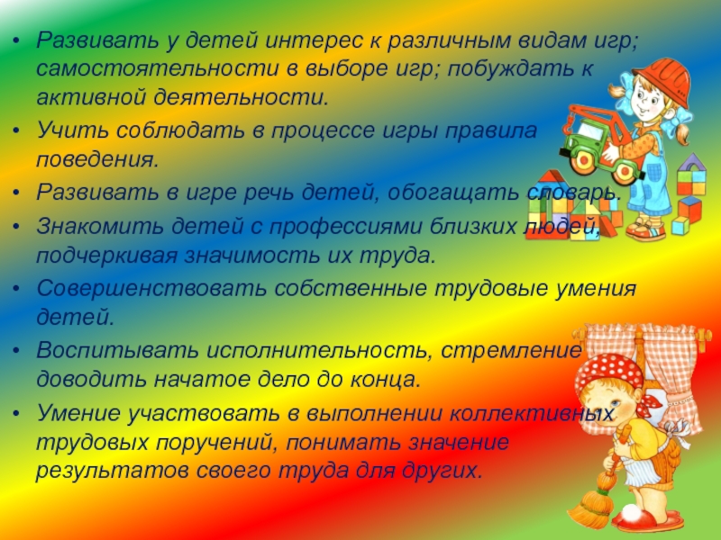 Слайд 5Развивать у детей интерес к различным видам игр; самостоятельности в выборе