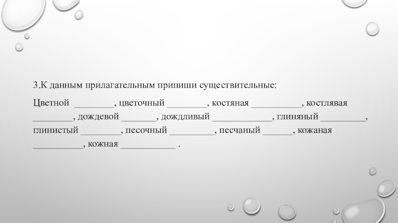 ________, дождевой _______, дождливый ____________, глиняный _________, глинистый ________, песочный _________, песчаный ______, кожаная __________, кожная ___________ .