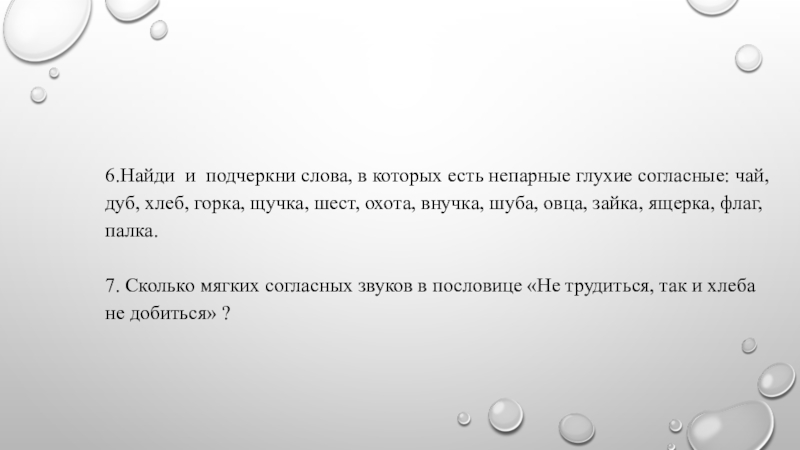 Слайд 76.Найди и подчеркни слова, в которых есть непарные глухие согласные: чай,