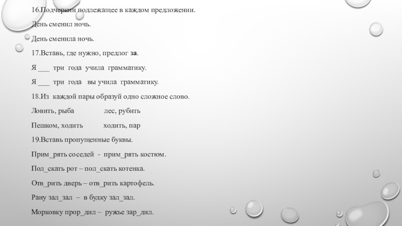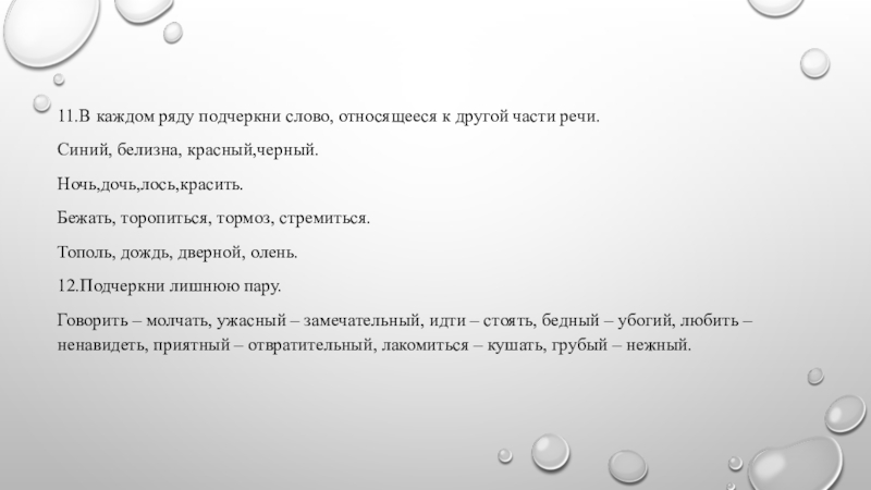 Слайд 911.В каждом ряду подчеркни слово, относящееся к другой части речи.