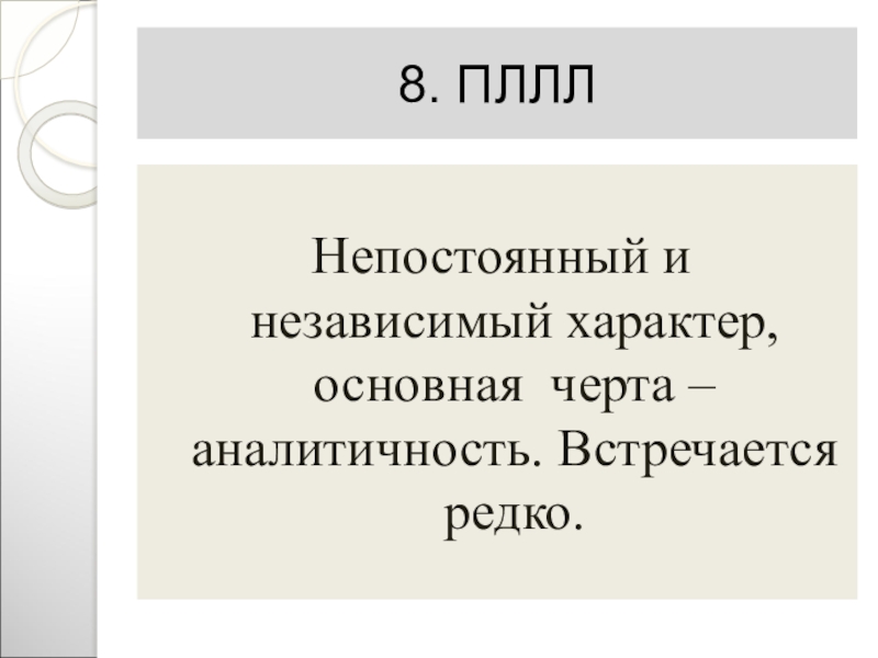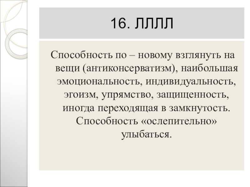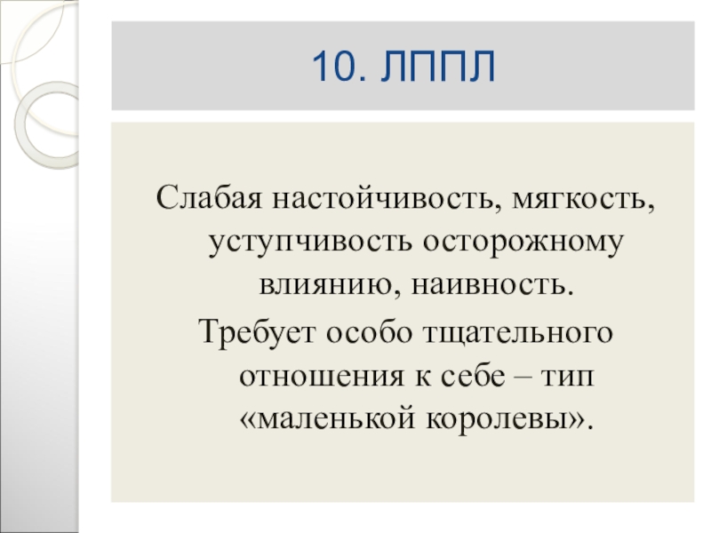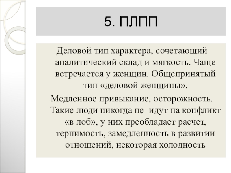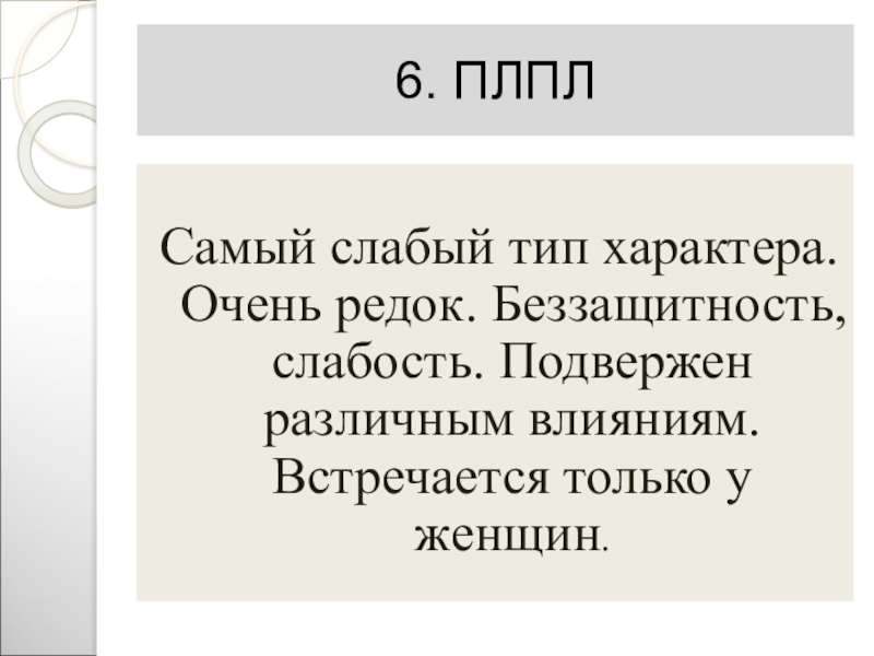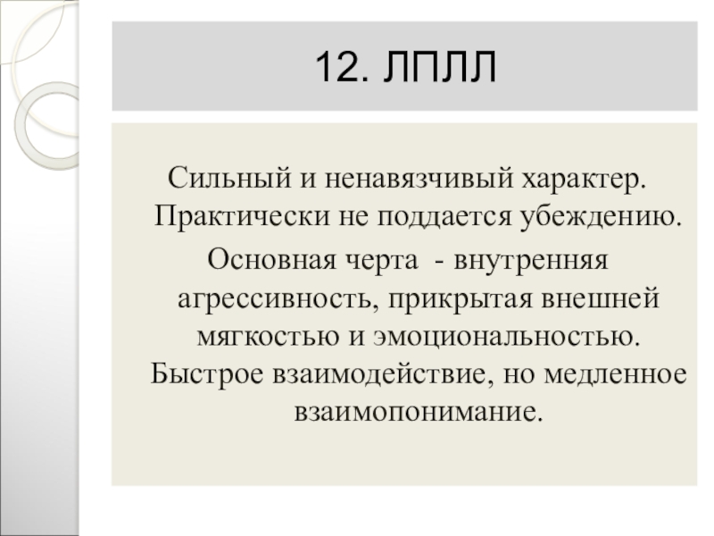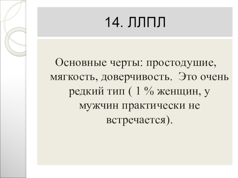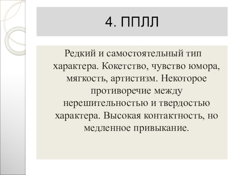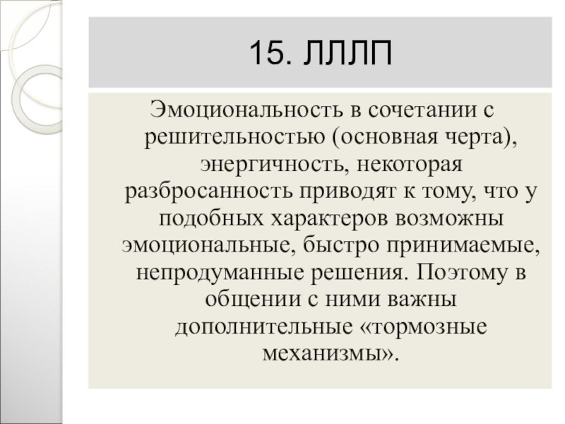Эмоциональность в сочетании с с недостаточной настойчивостью, которая прежде всего проявляется в основных стратегических вопросах (брак, образование и т.п.). Высокая подверженность чужому влиянию. Легко контактирует со всеми остальными типами характера. У мужчин эмоциональность понижена, наблюдается склонность к флегматичности.