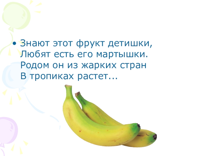 Знают этот фрукт детишки,  Любят есть его мартышки.  Родом он из жарких стран  В