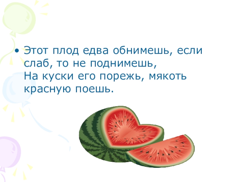 Этот плод едва обнимешь, если слаб, то не поднимешь, На куски его порежь, мякоть красную поешь.