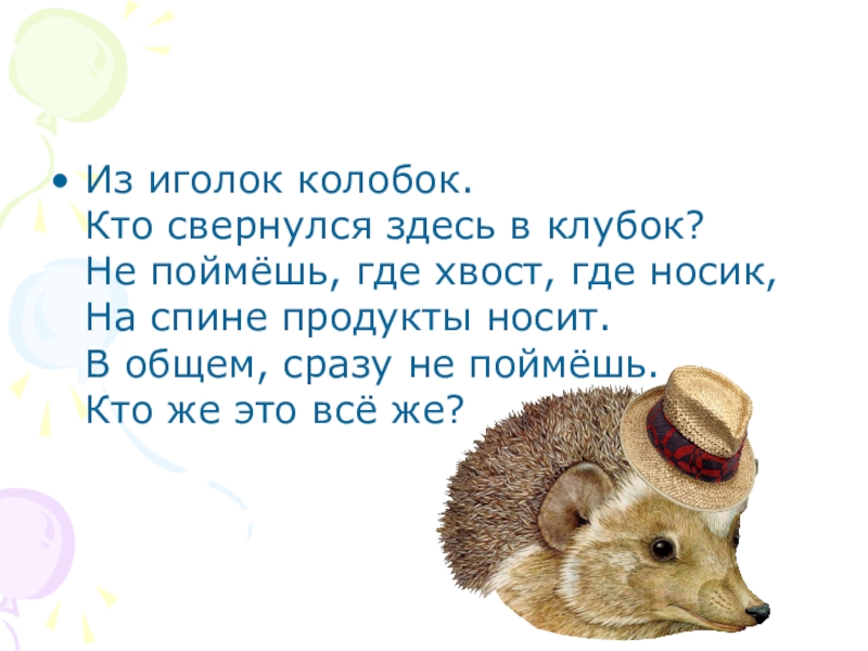 Из иголок колобок. Кто свернулся здесь в клубок? Не поймёшь, где хвост, где носик, На спине продукты