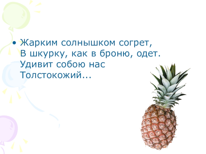 Жарким солнышком согрет, В шкурку, как в броню, одет. Удивит собою нас Толстокожий...