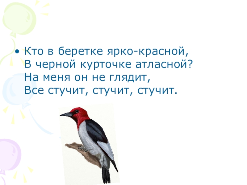 Кто в беретке ярко-красной, В черной курточке атласной? На меня он не глядит, Все стучит, стучит, стучит.
