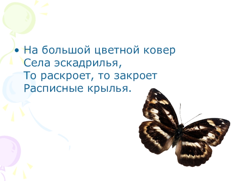 На большой цветной ковер Села эскадрилья, То раскроет, то закроет Расписные крылья.