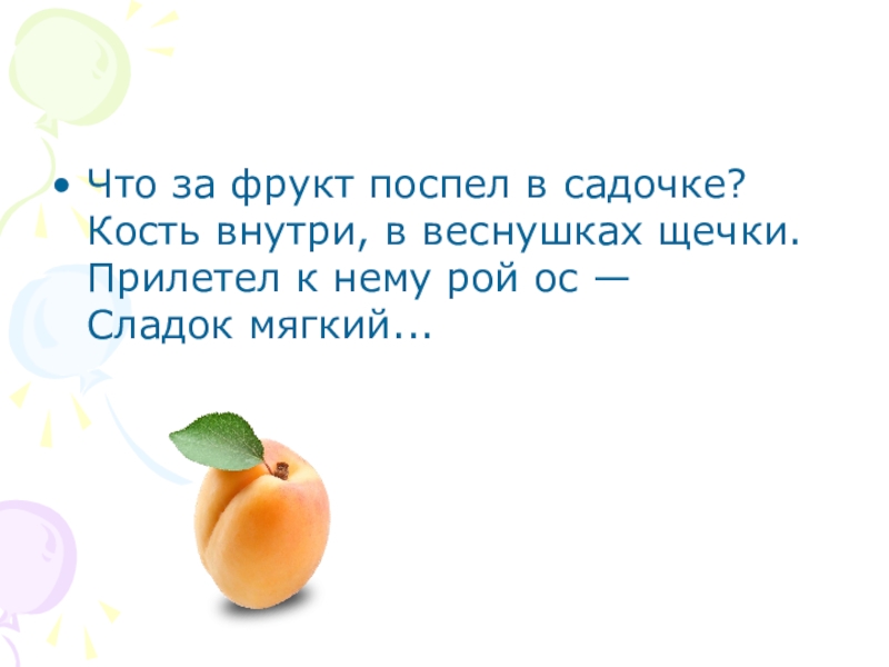 Что за фрукт поспел в садочке? Кость внутри, в веснушках щечки. Прилетел к нему рой ос —