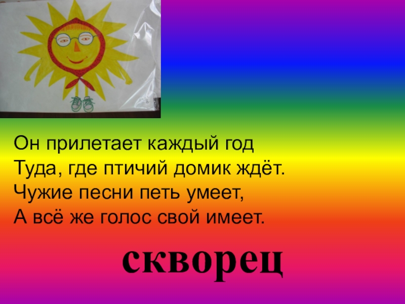 скворецОн прилетает каждый годТуда, где птичий домик ждёт.Чужие песни петь умеет,А всё же голос свой имеет.
