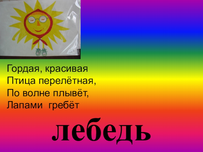 лебедьГордая, красивая Птица перелётная,По волне плывёт, Лапами гребёт