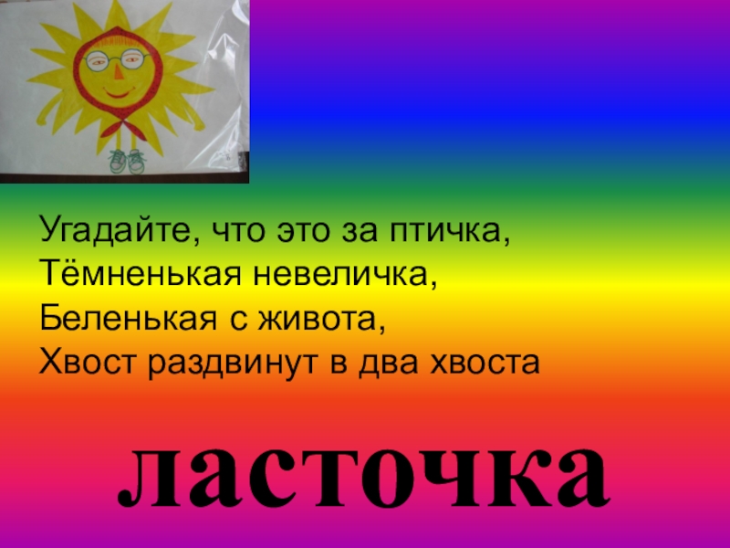 ласточкаУгадайте, что это за птичка,Тёмненькая невеличка,Беленькая с живота,Хвост раздвинут в два хвоста