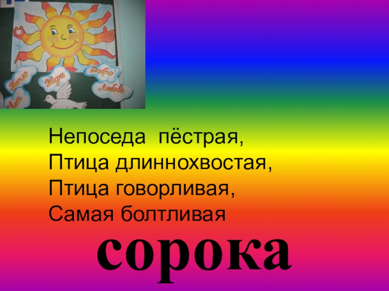 сорокаНепоседа пёстрая, Птица длиннохвостая,Птица говорливая,Самая болтливая