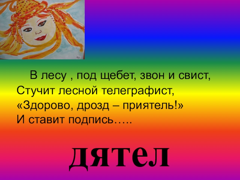 дятел  В лесу , под щебет, звон и свист, Стучит лесной телеграфист,«Здорово, дрозд – приятель!»И ставит