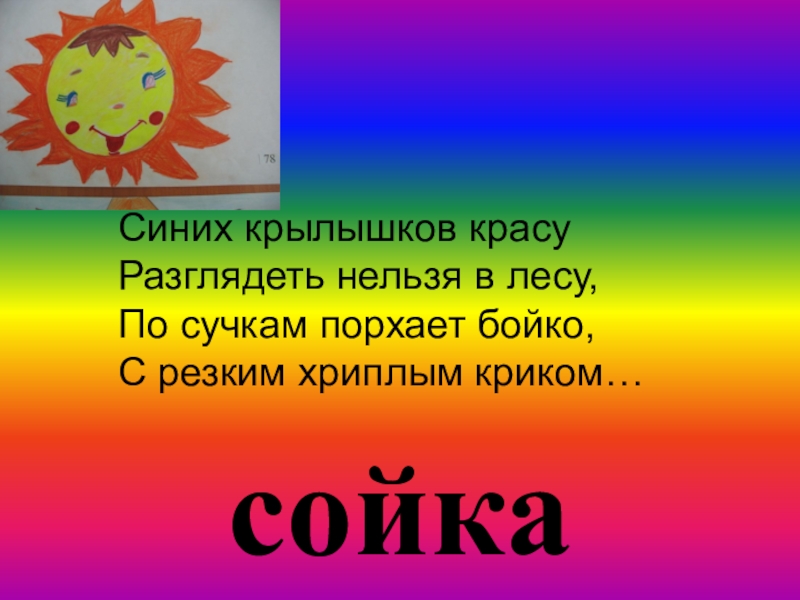 сойкаСиних крылышков красуРазглядеть нельзя в лесу,По сучкам порхает бойко,С резким хриплым криком…
