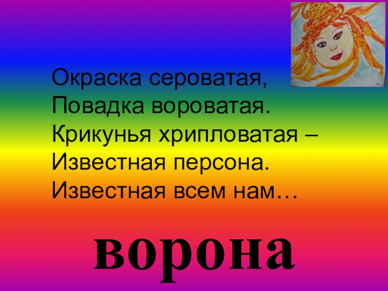воронаОкраска сероватая,  Повадка вороватая.Крикунья хрипловатая –Известная персона.Известная всем нам…