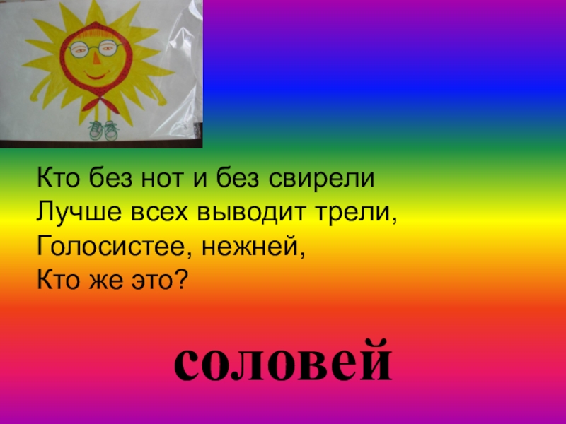 соловей Кто без нот и без свирели Лучше всех выводит трели, Голосистее, нежней, Кто же это?