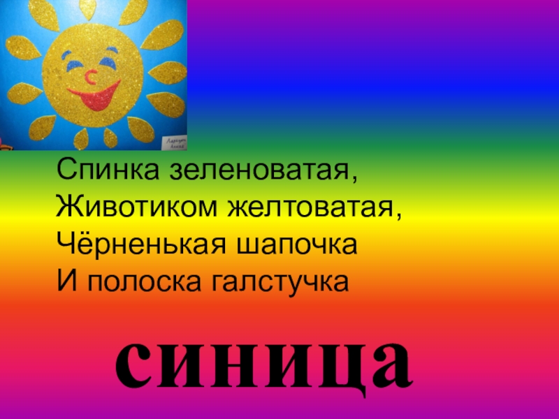 синицаСпинка зеленоватая,Животиком желтоватая,Чёрненькая шапочкаИ полоска галстучка